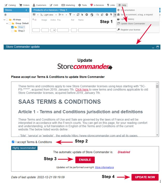In automatic mode, Store Commander will get updated without any action from you at 6:00am, the morning following the publication of the new version.