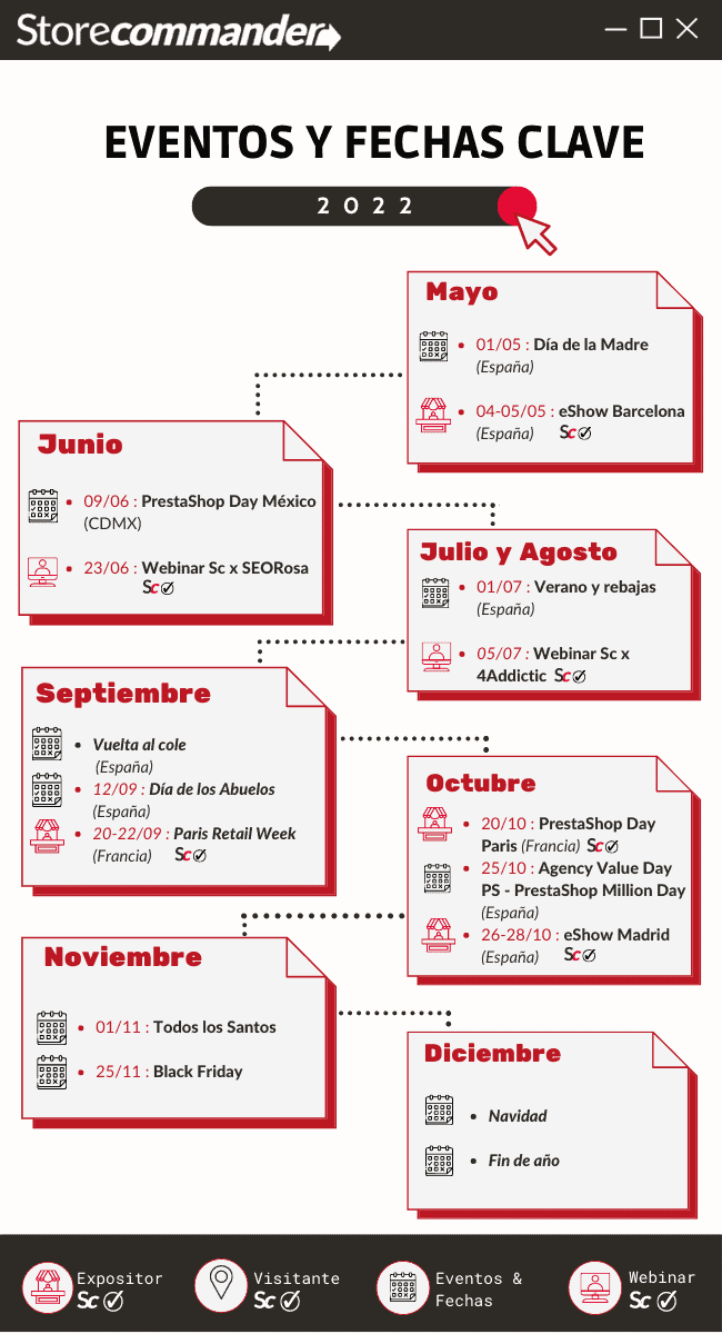 Desde Store Commander hemos elaborado una lista de fechas clave en 2022 para el comercio electrónico que no debe perderse. En esta lista, encontrará las distintas ferias en las que el equipo de Store Commander estará presente como expositor o visitante, y también los principales eventos del sector.