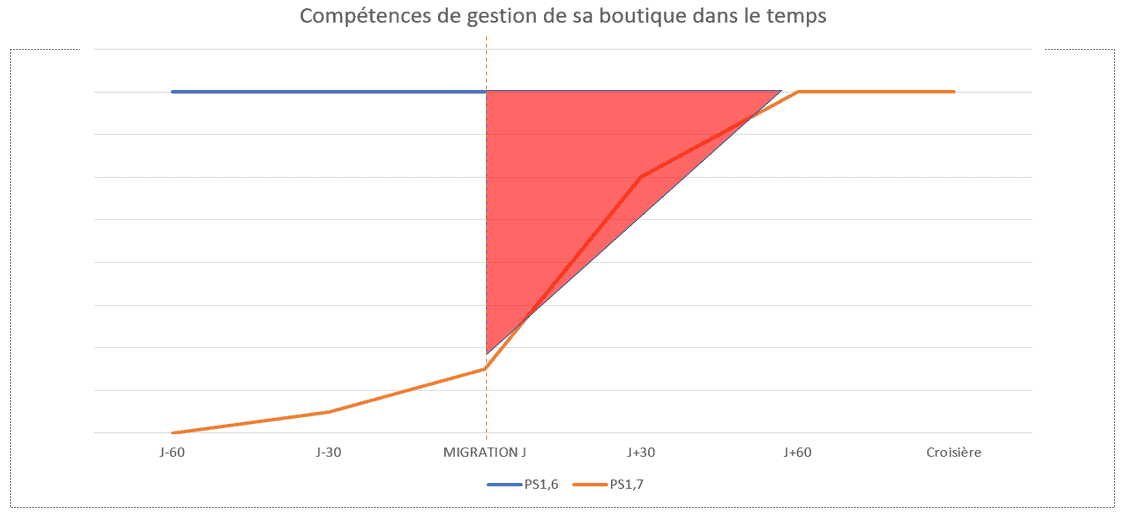 Comment répondre rapidement et de manière exhaustive à son client quand on ne maîtrise pas son outil de travail ? La méthode la plus efficace pour apprendre à se servir de PrestaShop, c’est encore de l’utiliser. Voici une représentation graphique du niveau de compétence d’un marchand avant, pendant et après sa migration.