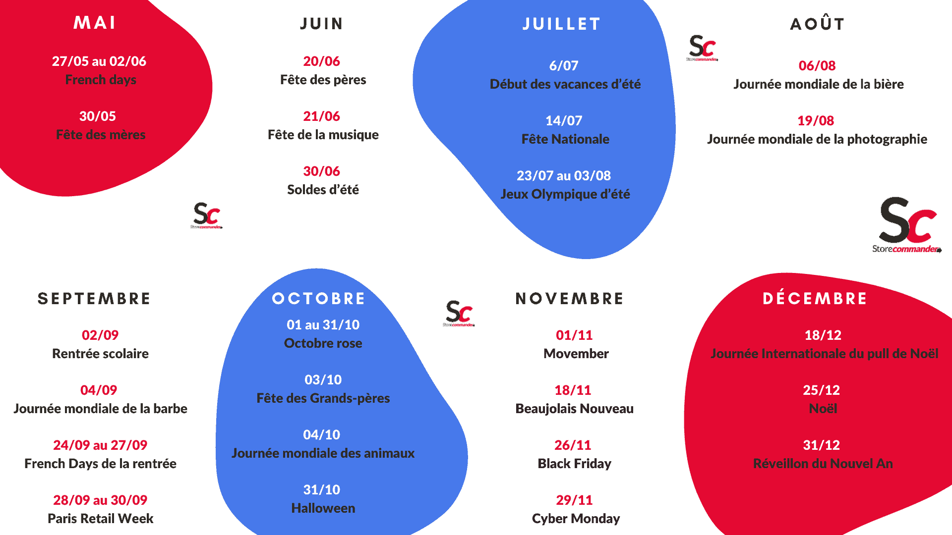 Alors, pour vous aider dans cette organisation, nous avons repéré les dates à ne surtout pas manquer. Ce calendrier (liste non exhaustive des dates clés) vous permettra de vous démarquer de vos concurrents. Comment ? En étant plus proche de vos clients, grâce à une expérience d’achat tendance et en phase avec l’actualité.