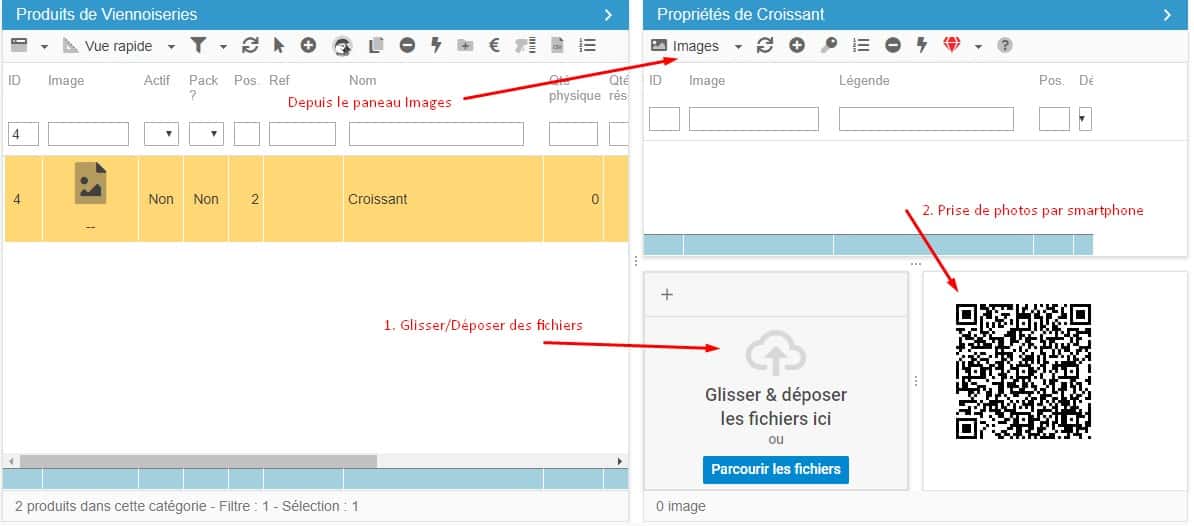 En "cliquant" sur "Ajouter les images" : celles-ci sont envoyées directement sur la fiche produit. La tâche fastidieuse de faire transiter les fichiers n'existe plus.
