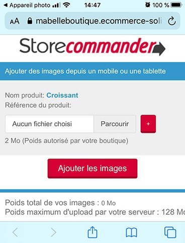 En "cliquant" sur "Parcourir" puis "Prendre une photo", vous placez la photo dans cet outil, prête à être envoyée sur votre boutique.