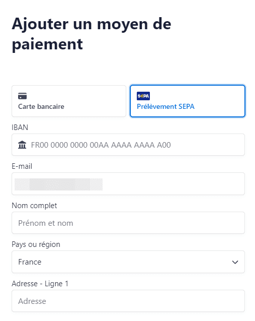 Renseignez votre IBAN ainsi que votre email, votre nom et prénom et votre adresse.