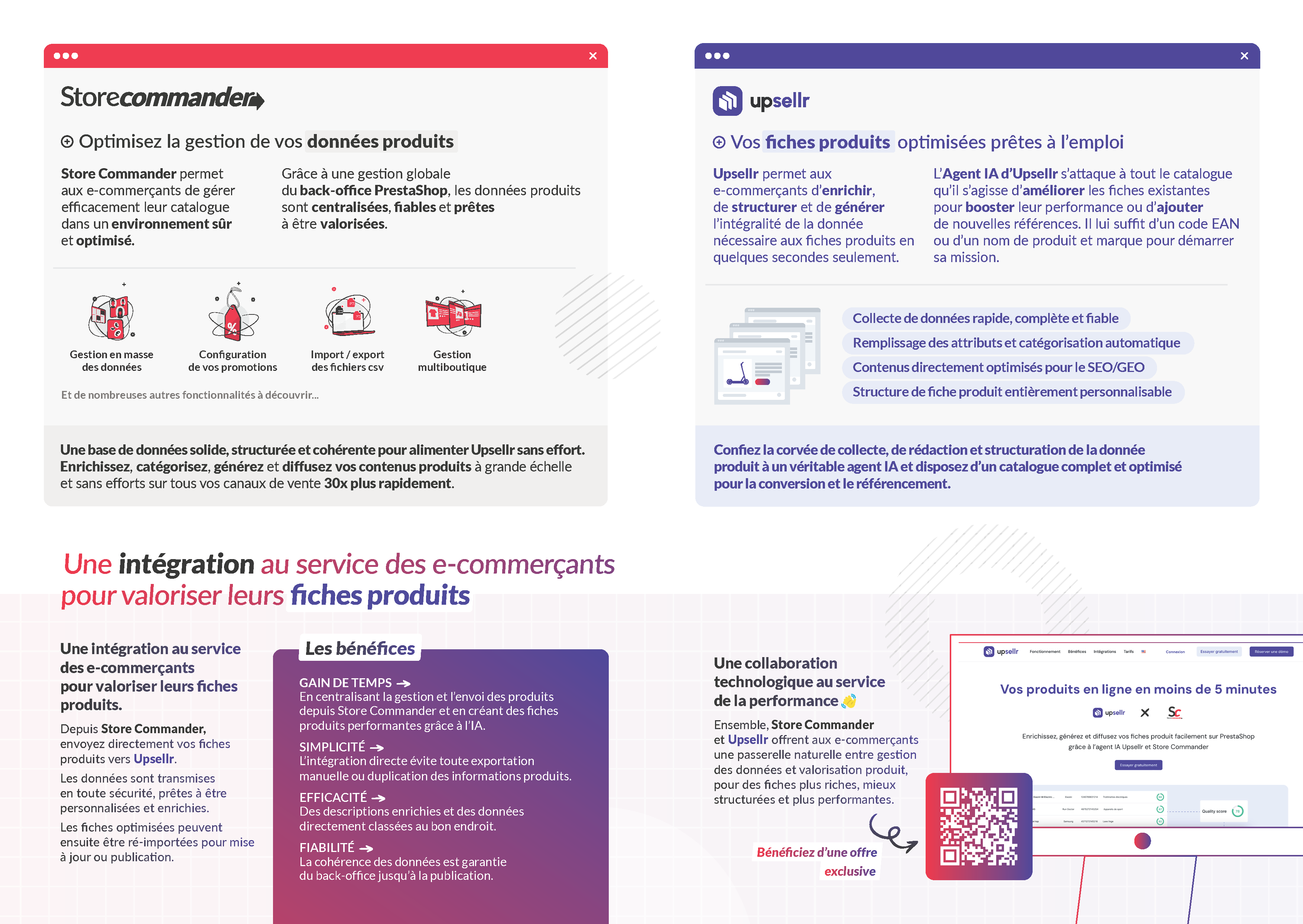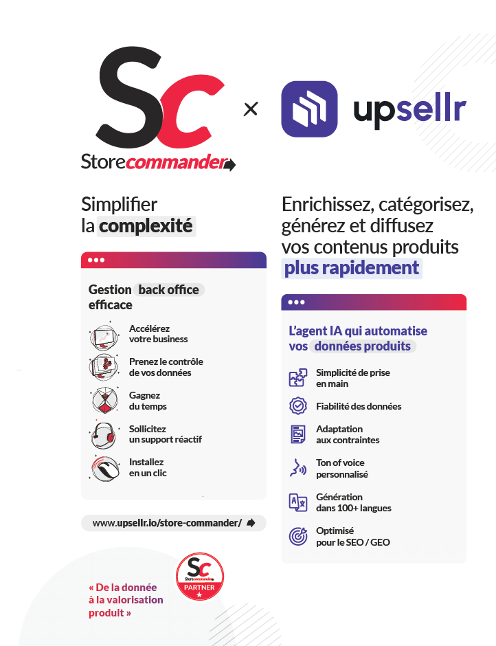 Store Commander sécurise et organise la donnée produit. Upsellr industrialise l’enrichissement des fiches. L’intégration relie les deux dans un workflow simple : donnée propre → enrichissement IA → publication.
